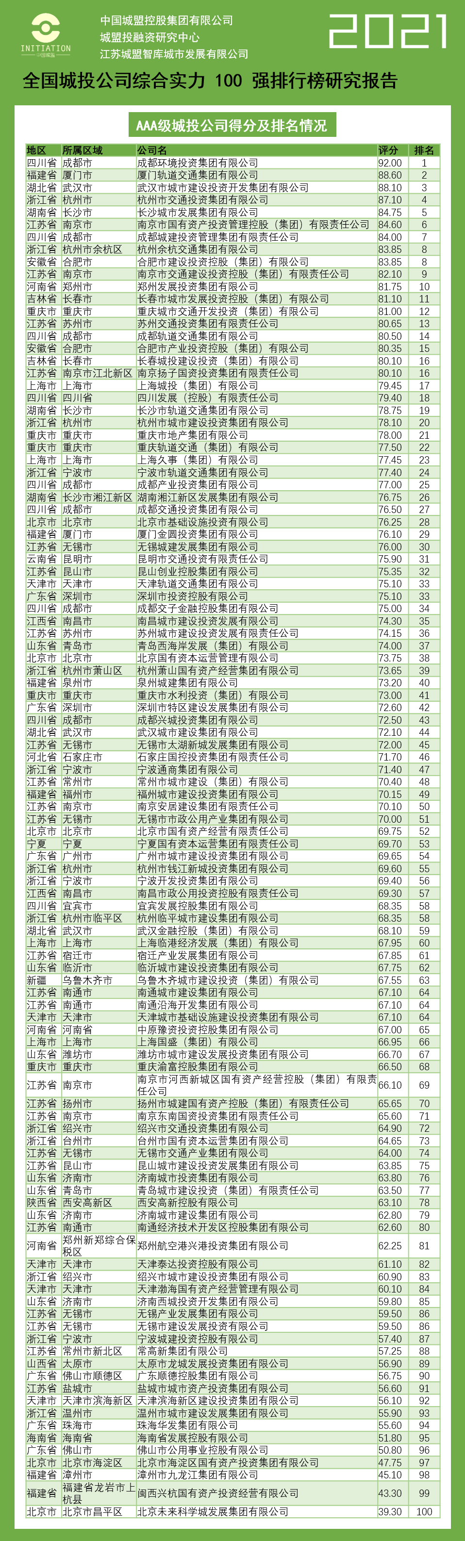 近日,城盟投融资研究中心选取在全国资本市场发行过债券的3519家地方政府(投)融资平台公司(金融界统称为“城投公司”),根据“DM城投评价指标”对上述公司综合实力进行打分排名。昆明市交通投资有限责任公司(以下简称“昆明交投公司”)入围AAA级城投公司百强企业、位列全国第31名。