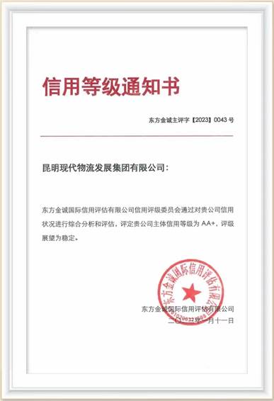 昆明交投公司下属现代物流集团获得AA+信用评级