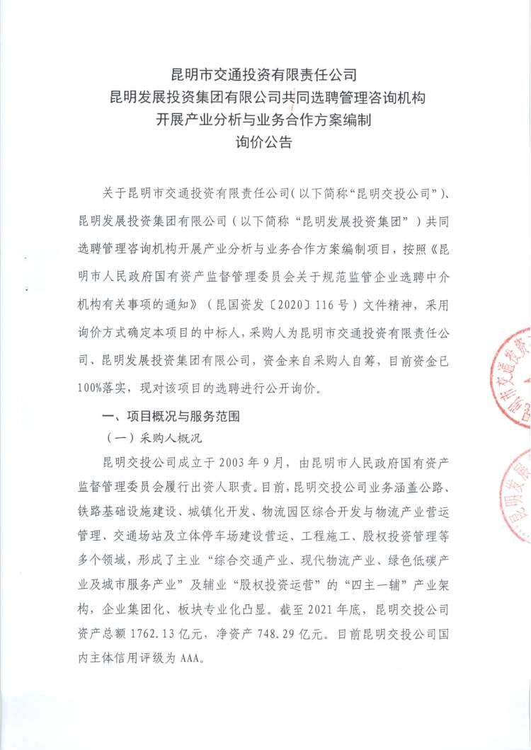 昆明市交通投资有限责任公司、昆明发展投资集团有限公司共同选聘管理咨询机构开展产业分析与业务合作方案编制公开询价项目在双方有关部门监督下,于2022年5月26日在云南省昆明市西山区盘龙路25号院1栋214室进行评审...