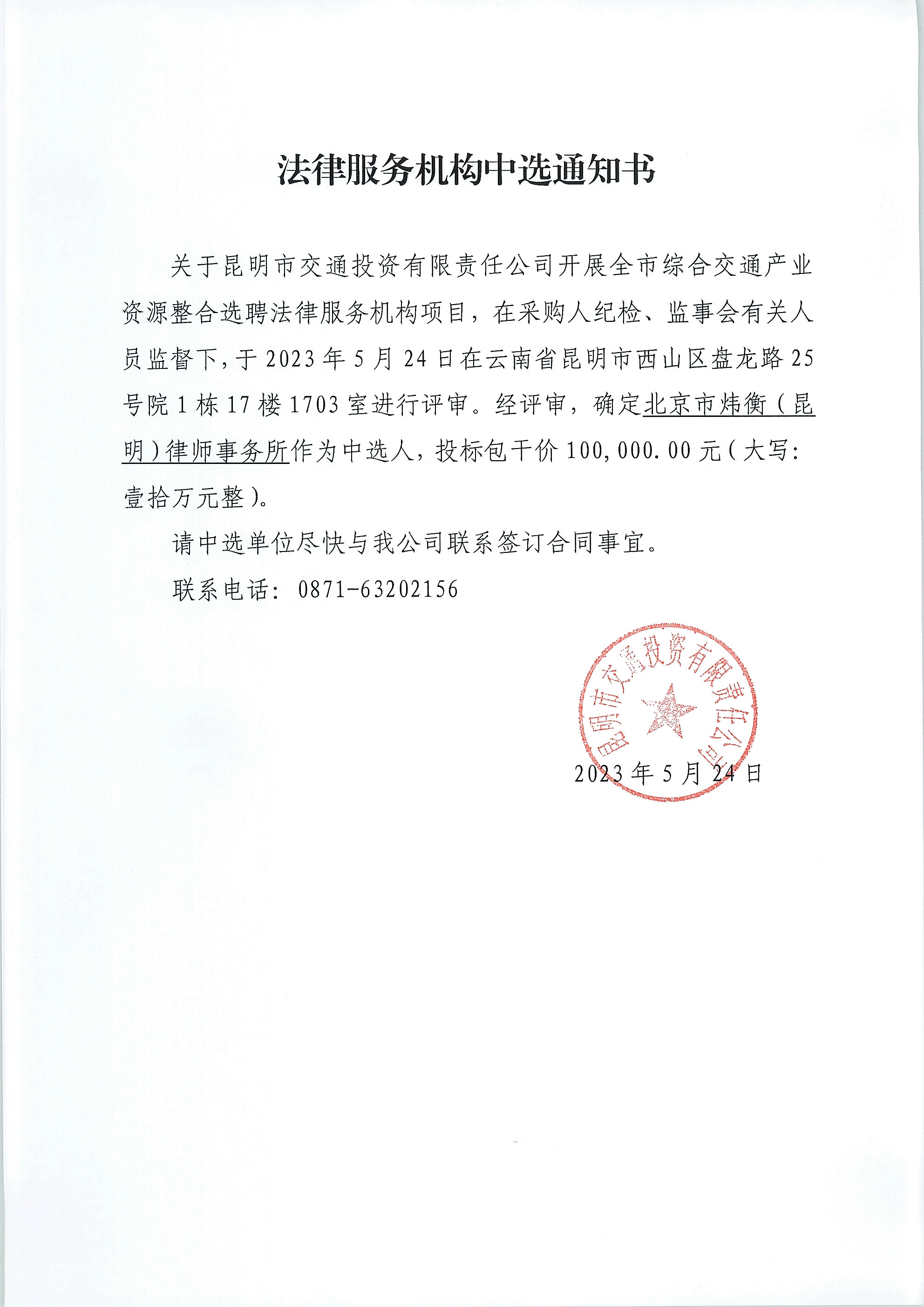 法律服务机构中选通知书